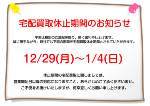 送料や査定料、振り込み手数料などは当店が負担致します。また、在庫状況により買取限度数を設けている場合がございます。
